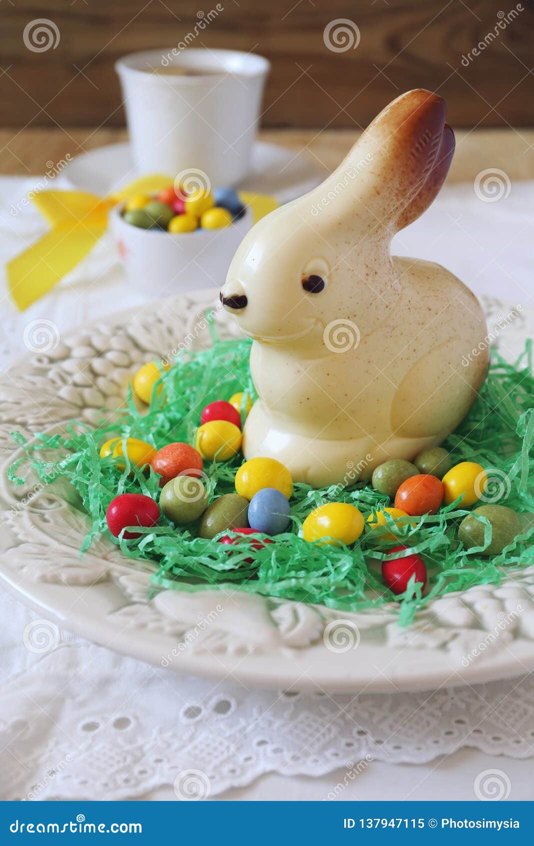 Easter Tea with Colorful Candy and White Chocolate Bunny Stock Image - Image of