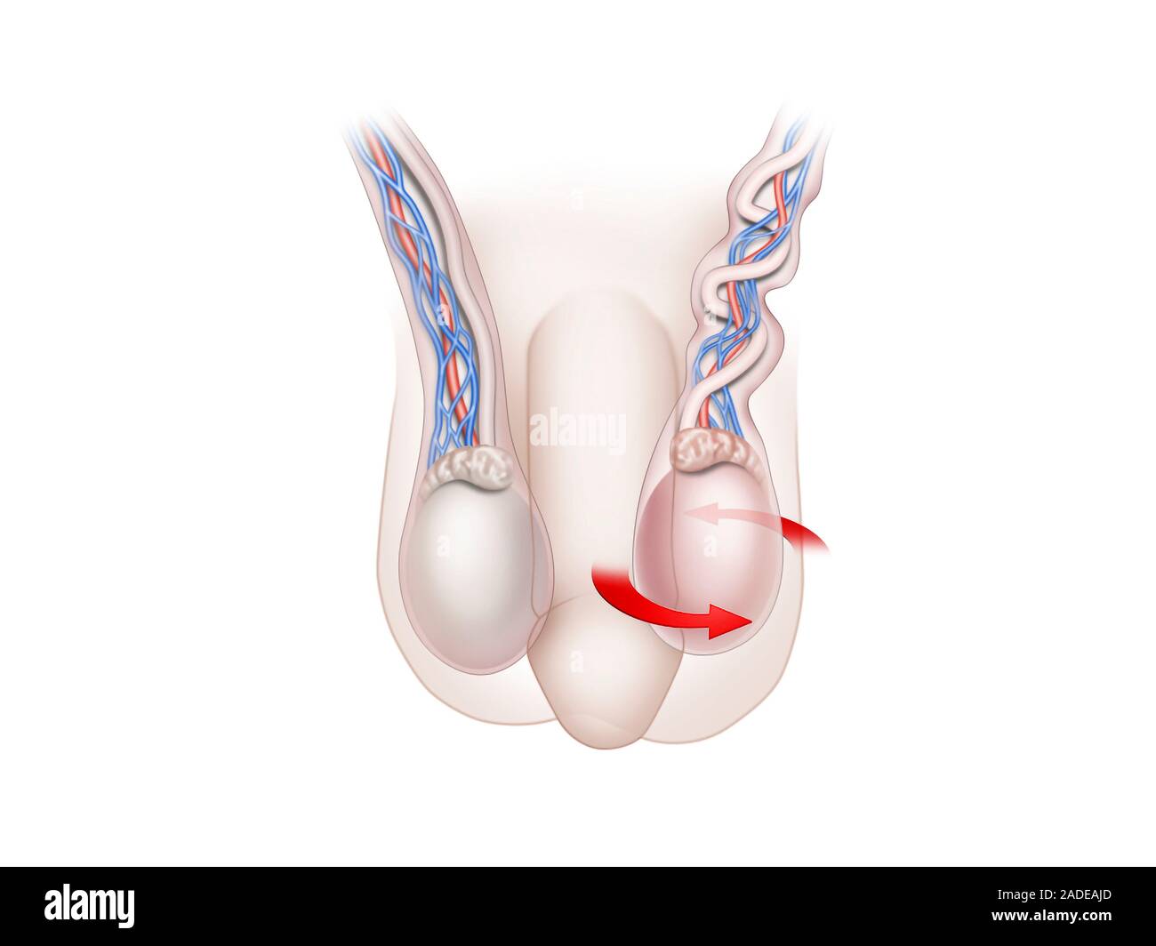 Testicular torsion, illustration. The testicle (testis) at right (the left-hand