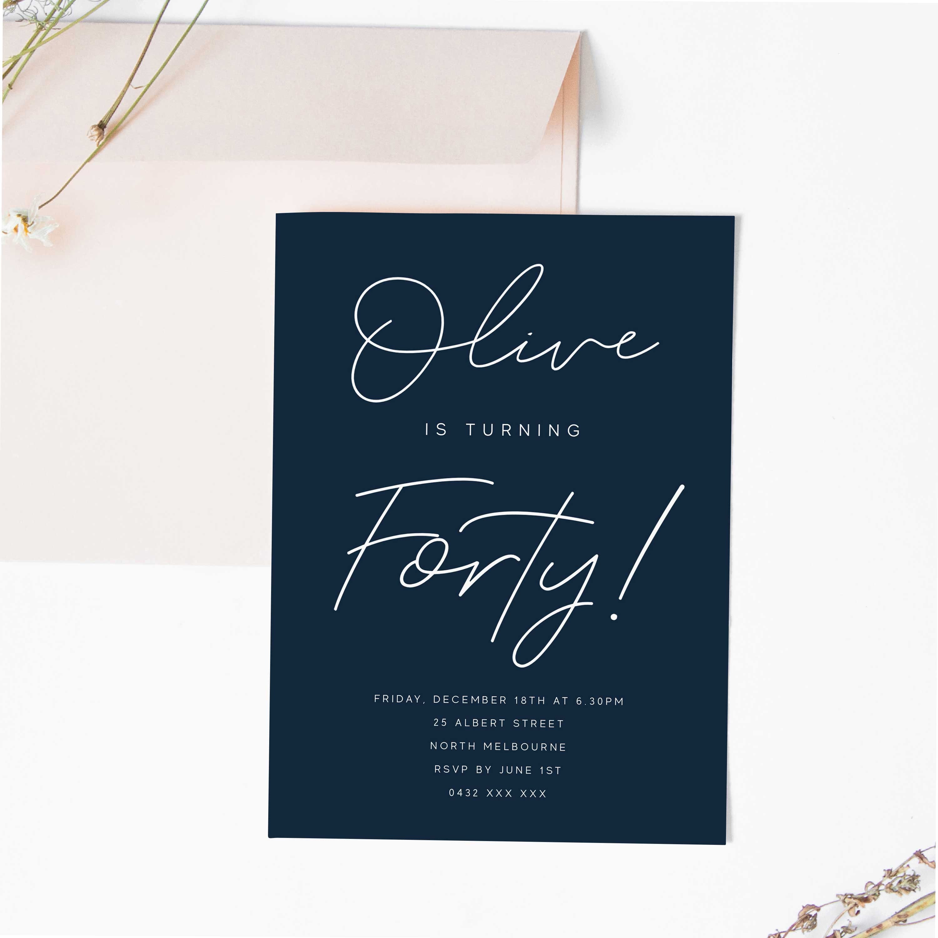 Navy Blue Printable 40th Birthday Invitation INSTANT DOWNLOAD Etsy