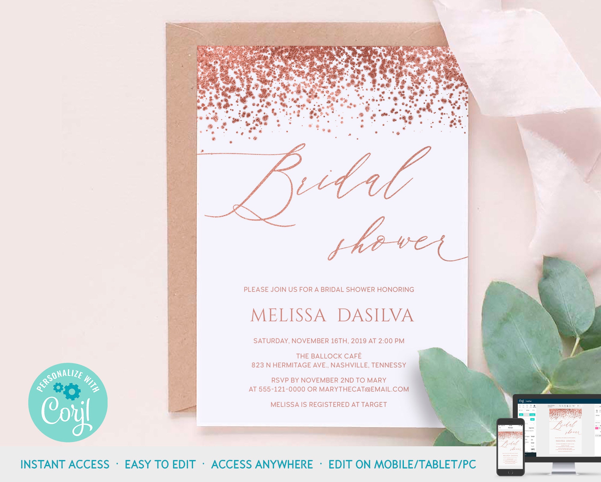 CLOE - Rose Gold Bridal Shower Invitation Editable Template Digita DIY By Violet